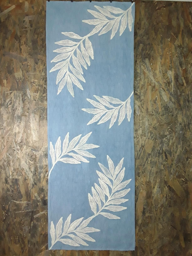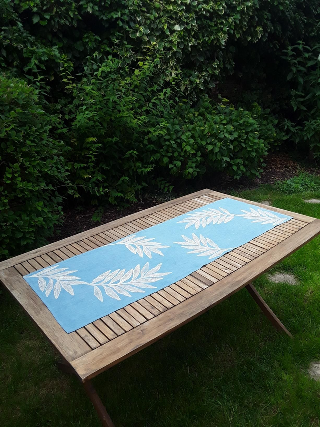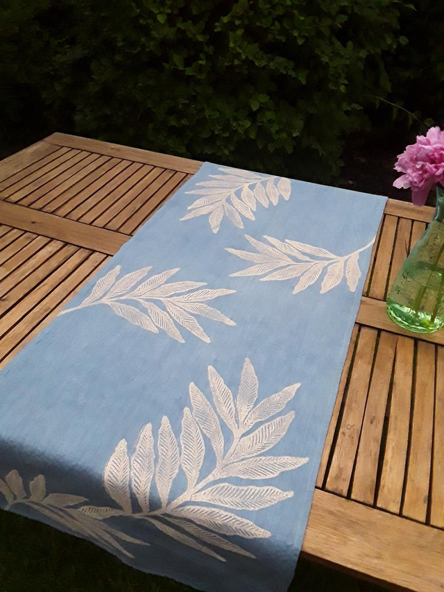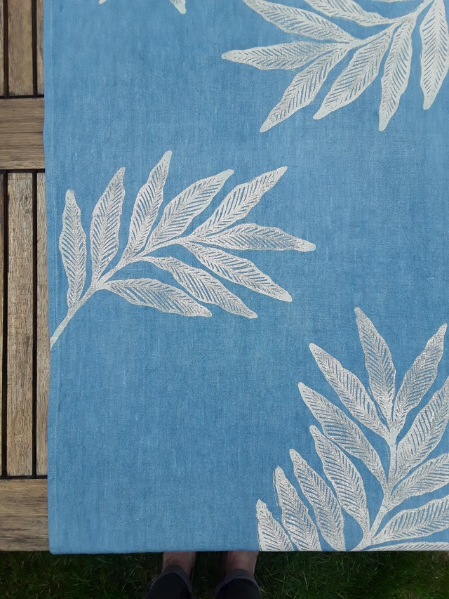Chemin de table en lin teinté à l'indigo. L' impression à la linogravure est une méthode d'impression la plus lente et simple, c'est ce qui donne des imprimés d'une grande subtilité et élégance de par ces variations et imperfections.