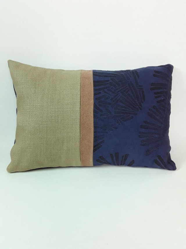De la collection PATCHWORK, ce coussin est composé de chutes de tissu. L' impression à la linogravure est une méthode d'impression la plus lente et simple, c'est ce qui donne des imprimés d'une grande subtilité et élégance de par ces variations et imperfections.