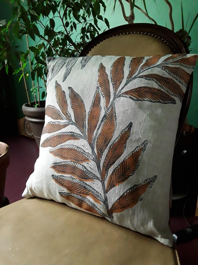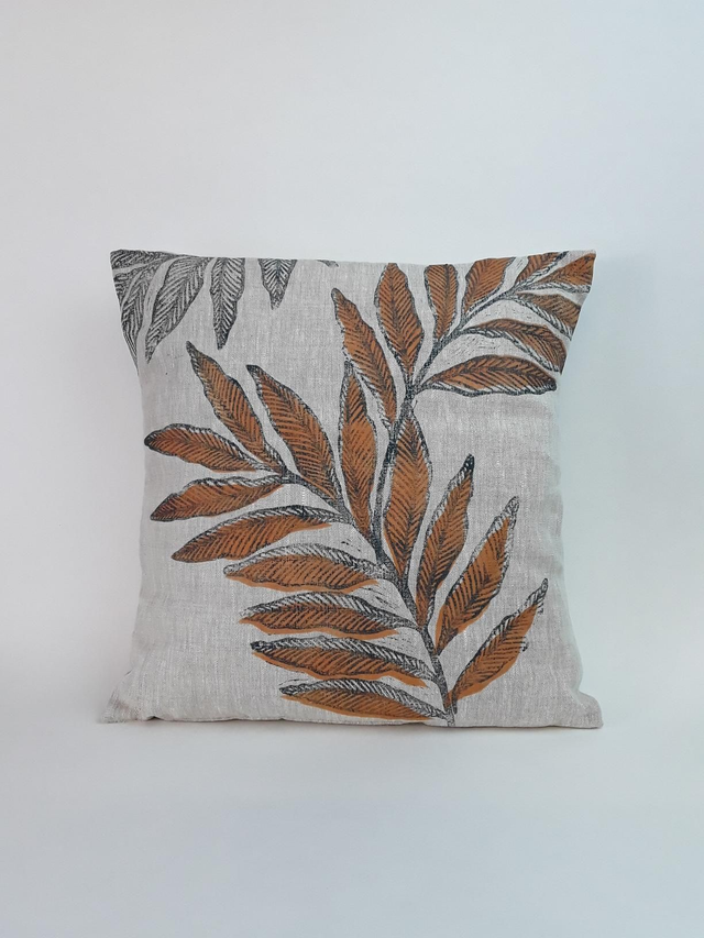 Coussin en lin imprimé à la linogravure. L' impression à la linogravure est une méthode d'impression la plus lente et simple, c'est ce qui donne des imprimés d'une grande subtilité et d'élégance de par ces variations et imperfections.