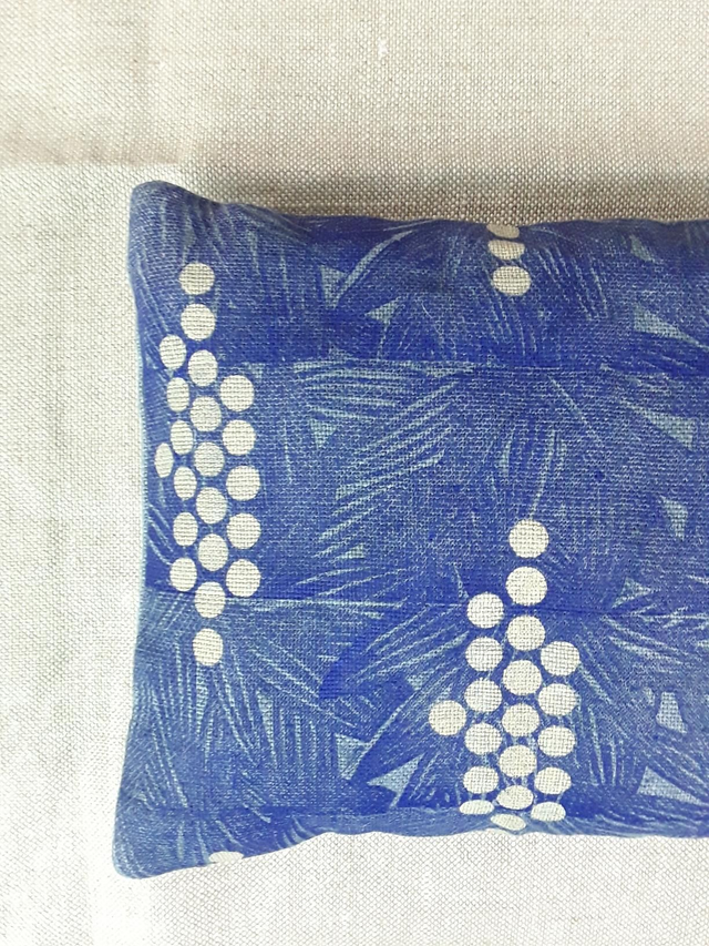 Coussin en lin teinté à l'indigo. L' impression à la linogravure est une méthode d'impression la plus lente et simple, c'est ce qui donne des imprimés d'une grande subtilité et élégance de par ces variations et imperfections.